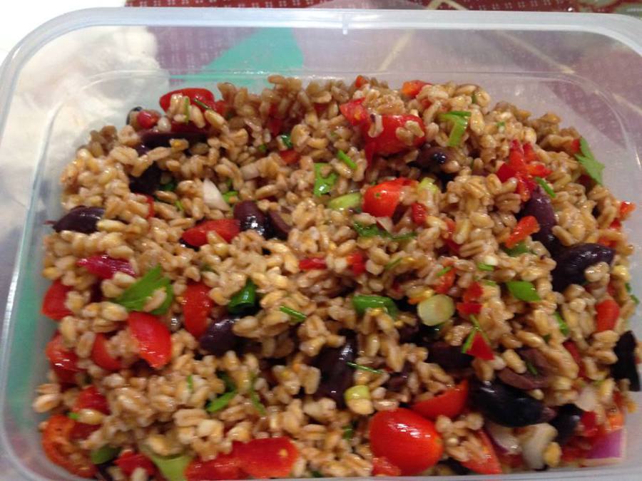 In another bowl combine the scallions, bell pepper, red onion, tomato, parsley, chives and olives. Let the farro cool down until it is warm and then toss the other ingredients into the bowl with the farro. When these ingredients marry it will be a fragrant symphony for the senses. And it gets better! Combine the balsamic vinegar and olive oil in a small bowl, whisk together and pour over the farro, veggie, and herb mixture. Toss well and add salt and pepper to taste. * you may have to adjust the amount of balsamic and olive oil, if the mixture is too dry and you are not getting the flavor of the dressing, adjust by adding a little more directly to mixture. Enjoy!!