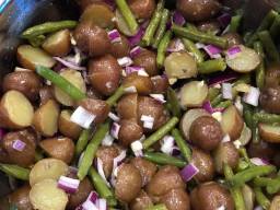 When the potatoes are cooked, fork tender. Drain the water and when they are cool enough to handle cut them in half and or depending on the size, quarter them and add them to the bowl with the onion and garlic. Drizzle a little olive oil over the potatoes. Add the cooked green beans to the bowl. Drizzle a little more olive oil over the beans and toss all the ingredients in the bowl together. Add more olive oil as necessary to lightly coat the salad. Add the sea salt, ground black pepper and garlic powder.