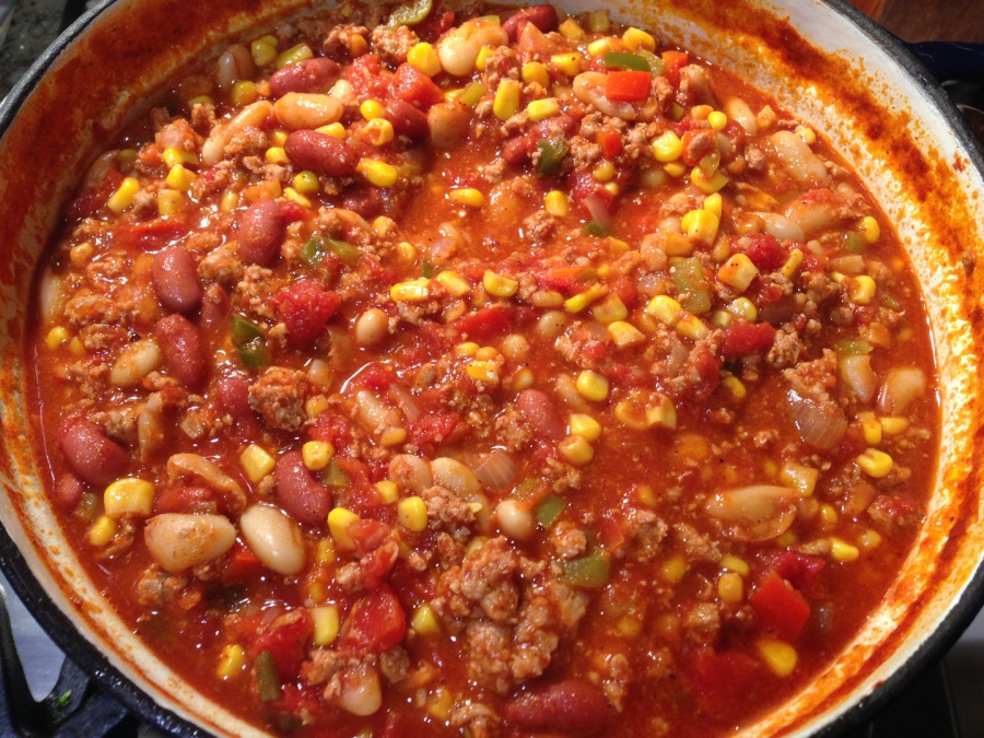 Chili is something that we have always enjoyed and my husband especially is a big fan of homemade chili. My basic chili often has most the same ingredients listed below with a couple of exceptions no turkey, turkey sausage or corn. Most often I use eye of the round or another cut of beef that I cube, braise and then add to the chili sauce and sometimes I will also add small pieces of pork or some shredded pork shoulder. And sometimes I will make a quick chili using ground beef or a combination of ground beef and pork. My chili is meaty and hearty and has always been a hit with my family. In an effort to get into better eating habits I decided to make chili with ground turkey and added some sweet and hot turkey sausage for a little kick. My husband John suggested we add some corn and what resulted was a hearly and delicious chili. My beloved loved the chili so and was surprisingly pleased at the heartyness of it. What surprised him most is that he said he would not have known he was eating turkey if I did not tell him. So this is a chili recipe that works for us. I would not classify this as the healthiest of meals, but the subsitution of the ground turkey for the beef makes it great alternative to beef. That it is so tasty and hearty is a great big bonus! For more tips on how we make this great dish check out our Turkey Chili Video. Like with all recipes, have fun with it, adopt the seasoning to your liking and make it your own! Enjoy!