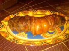 My dad's Porchetta is one of our family favorites. It is made with a pork shoulder simply seasoned, rolled, tied and roasted with the skin left on. After hours of roasting, the fat from the skin keeps the meat tender and juicy and the skin crisps up. I remember my parents always looking in the market sales flyers for good deals and when pork was on sale my parents would get a few roasts. My dad would debone them, flaten them out and season them heartily with black pepper, salt and garlic salt. He season them, roll them, tie them and then wrap them well and freeze them so they would be ready and on hand whenever he wanted them. My parents were known for impromtu meals. If you stopped in for a visit it was a guarantee that within minutes a womderful spread of food was sure to follow and by the time the first few courses were finished out would come the steaming delicious prochetta with a fresh garden salad, usually made with ingredients fresh from thier bountiful garden. And I can't think of Porchetta without thinking of our annual family pig roasts. Our pig roasts were usually held on Labor Day. The simply seasoned pig was slow roasted for hours on end on a large homemade spit attached to an outdoor cement and brick barbeque and cooking area that my dad, grandfather and brother built in our backyard. Tables were placed in the street and the neighborhood would all come together to enjoy the day. Some of my fondest memories are the pig roasts with our wonderful neighbors, freinds and relatives. The pictures below the recipe were take by our neighbor Jack during one of our many pig roasts. That year the pelting rain could not dampen the day. The tables were moved from the street into the cover of Jack and his wife Pat's garage where we relaxed between the rain showers and feasted on a wonderful meal including the delicious pig roasted in daddy's spit accompanied by side dishes prepared and shared by everyone in the neighborbood. I don't make Porchetta often but when I do, I cant help but cast a loving glance back to treasured times and memories. Today our cousins carry on the tradition of the annual pig roast. It is wonderful not only to get together with the family for a pig roast but it is a true blessing to see the younger generaton taking over, planning, organizing and hosting and most of all keep up family traditions for the little ones and the generations to come.